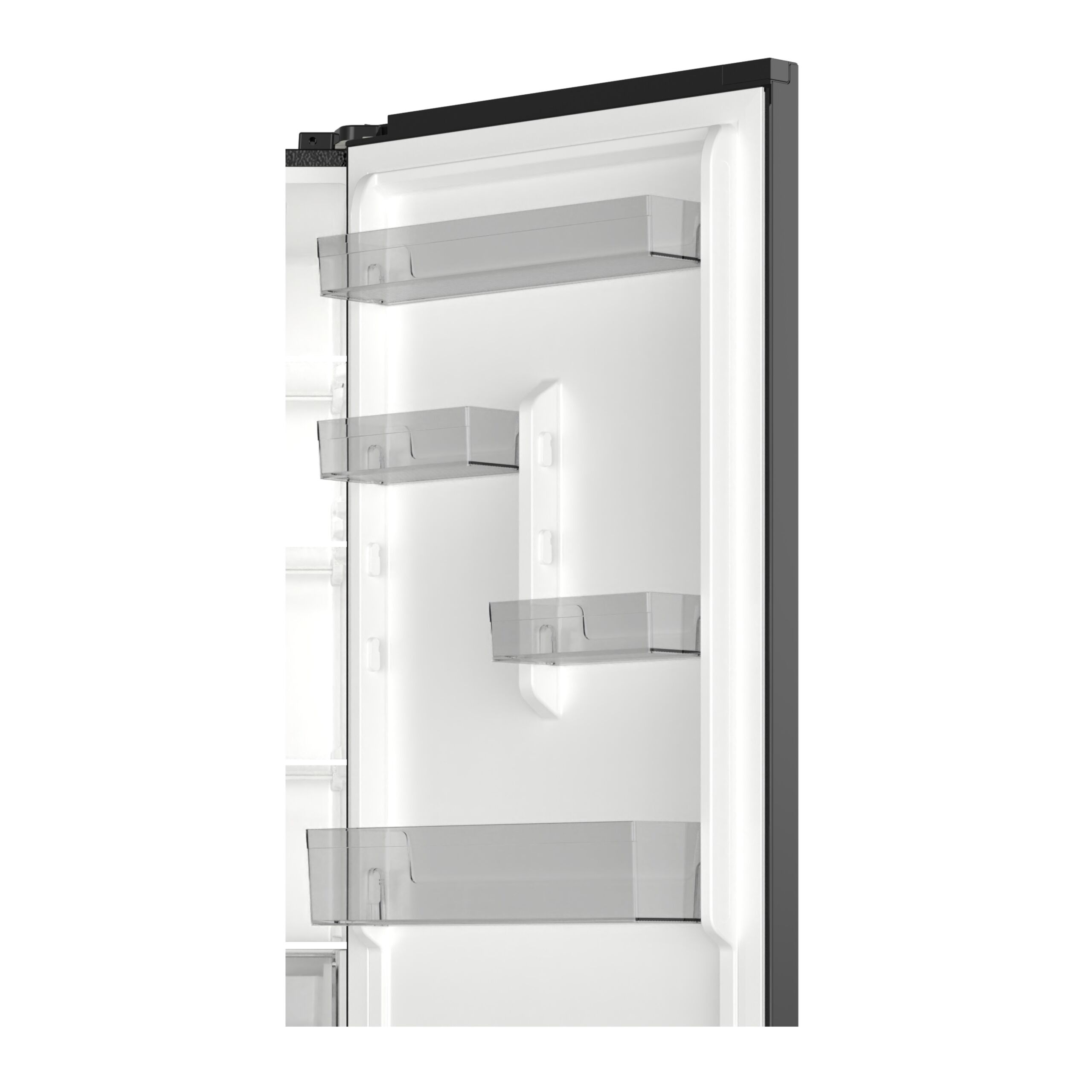 Dużym atutem tego modelu jest fakt, że szerokość urządzenia pozostaje taka sama nawet po otwarciu drzwi pod kątem 90°. Dzięki temu łatwiej ustawisz lodówkę blisko mebli lub ściany. Dodatkowo brak standardowej tylnej kratki skraplacza wystającej poza obudowę zapewnia rzeczywistą głębokość 60 cm. W efekcie łatwiej wykorzystasz dostępne miejsce w kuchni.